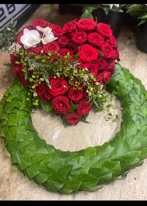Original pris 2.200,00 kr - Original pris 3.000,00 krOriginal pris2.200,00 kr - 3.000,00 kr2.200,00 kr - 3.000,00 krNuværende pris 2.200,00 krBladkrans lavet med et påsat hjerte i røde roser. Og med en orkide tilføjet Pris som billede uden bånd 2500