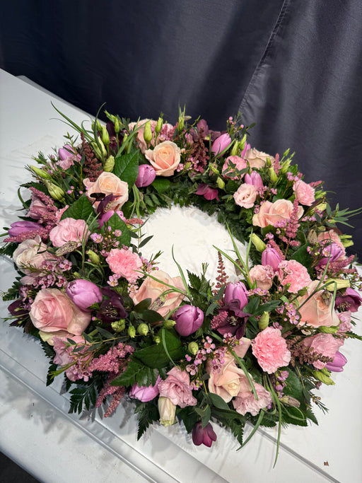 Original pris 1.800,00 kr - Original pris 2.500,00 krOriginal pris1.800,00 kr - 2.500,00 kr1.800,00 kr - 2.500,00 krNuværende pris 1.800,00 krI denne krans indgår roser kombineret med sæsonens blomster i samme farve efter dit valg. Som foto uden bånd kr 1800,- Bånd er tilkøb